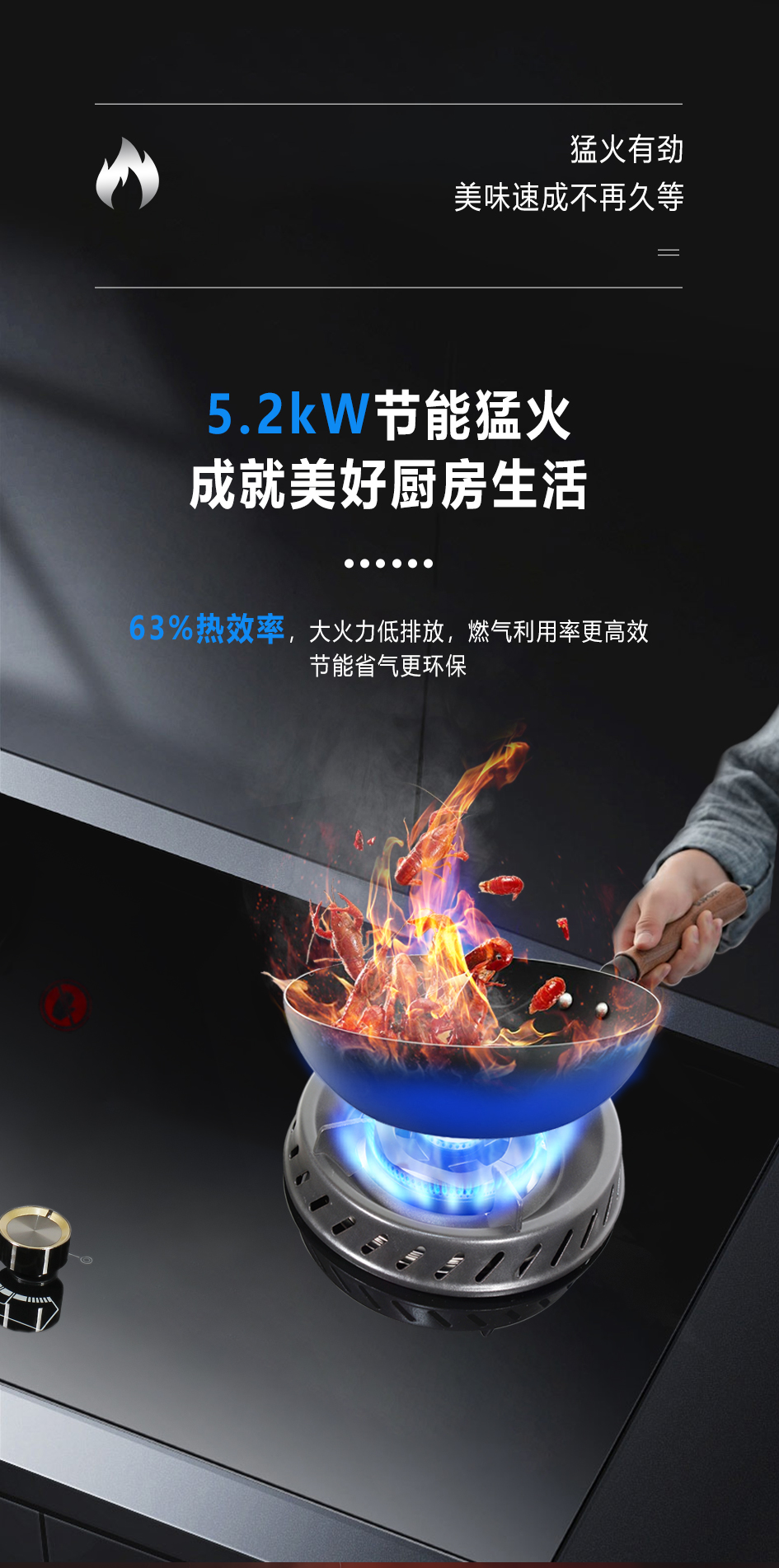 5.2kW聚能猛火灶,63%熱效率一級能效,帶熄火保護